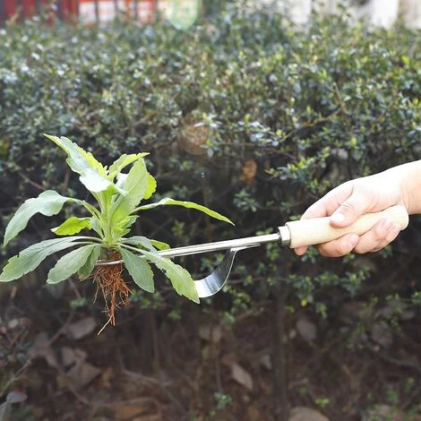 Matériau de haute qualité: La pointe fourchue à dents du désherbeur est en acier inoxydable de haute qualité qui est antirouille et magnifiquement polie, extrêmement robuste et tranchante. Conçu avec une poignée en bois qui maintient vos mains à l’aisependant le jardinage.