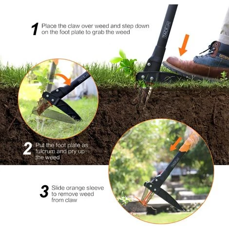 【3 GRIFFES DESIGN À HAUTE EFFICACITÉ】 L’extracteur utilise un design spécial à trois couteaux qui améliore la stabilité. La poignée de 100 cm permet d’éliminer les mauvaises herbes et de se plier vers le bas, peut aider à éliminer la douleur causée par les douleurs du genou et du dos. La pédale permet d’exercer une force suffisante sur l’herbe pour pénétrer dans le sol et saisir l’ensemble de l’herbe