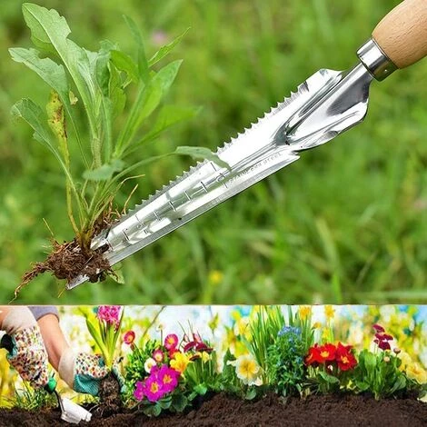 Conception multifonctionnelle : le Désherbeur À Main en Acier Inoxydable a une tête dentelée, qui peut couper les racines et le sol compactés, et intègre les fonctions de sciage, d’exposition, d’enracinement, de mesure et d’éradication.